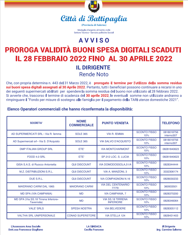 Buoni spesa per fronteggiare la pandemia da Covid-19: altre tre settimane di tempo. Lo rende noto un avviso pubblico a firma del dirigente dell’Ufficio tecnico, Carmine Salerno, che con una determina dello scorso 31 marzo ha prorogato il termine per l’utilizzo della somma residua assegnata sui buoni spesa digitali, quest’ultimi erogati dall’Ente durante il periodo emergenziale, fino al prossimo 30 aprile. Tutti i beneficiari, dunque, avranno altre tre settimane di tempo circa per usufruire dei ticket presso tutti i punti vendita associati. Sono 12 le attività commerciali, elencate sia nel manifesto che sul sito dell’Ente, che hanno deciso di aderire all’iniziativa pensata appositamente per dare sostegno a tutte le famiglie in difficoltà e maggiormente danneggiate dall’emergenza pandemica, distribuite omogeneamente nei vari quartieri della città. L’offerta prevede un 10% di sconto fisso su tutti i prodotti. Al termine di aprile, tutte le somme residue e inutilizzate non andranno perse: serviranno a rimpinguare il “Fondo per misure di sostegno alla famiglia per il pagamento della Tari (la tassa sui rifiuti) utenze domestiche 2021”.