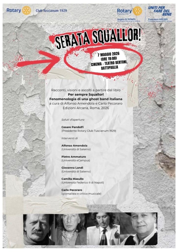 BATTIPAGLIA – Dissacranti, surreali e profondamente liberi. A decenni di distanza dal loro esordio, gli Squallor continuano a far discutere e a influenzare la cultura popolare italiana. Per celebrare questa eredità artistica, giovedì 7 maggio 2026, alle ore 19:00, il Cinema-Teatro Bertoni farà da cornice alla “Serata Squallor!”, un evento che promette di unire l’analisi accademica al racconto appassionato. L’occasione è la presentazione del volume “Per sempre Squallor! Fenomenologia di una ghost band italiana” (Edizioni Arcana, 2026), curato dai docenti e saggisti Alfonso Amendola e Carlo Pecoraro. Il libro si propone di decodificare il linguaggio unico di un gruppo che, pur senza mai apparire in pubblico o esibirsi dal vivo, è riuscito a scalare le classifiche e a diventare un vero e proprio oggetto di culto attraverso la satira più feroce e geniale. La serata, organizzata sotto l’egida del Rotary Club Tuscianum 1929, si aprirà con i saluti istituzionali del presidente Cesare Pandolfi. Seguirà un dibattito interdisciplinare che vedrà la partecipazione di esperti di comunicazione e critica musicale. Oltre ai curatori Amendola (Università di Salerno) e Pecoraro (giornalista e critico musicale), interverranno Pietro Ammaturo (Università eCampus), Giovanna Landi (Università di Salerno) e Camilla Masullo (Università Federico II di Napoli). Non si tratterà di una semplice presentazione editoriale: il programma prevede un’alternanza di “racconti, visioni e ascolti”, permettendo al pubblico di immergersi nuovamente in quel mondo fatto di personaggi grotteschi, parodie musicali e intuizioni linguistiche che hanno segnato un’epoca. L’appuntamento rappresenta un momento significativo per la comunità di Battipaglia, richiamando l’attenzione su una delle realtà artistiche più originali e controverse del nostro Paese, capace di nascondere, dietro l’apparente volgarità, una critica sociale affilatissima e un talento compositivo fuori dal comune.